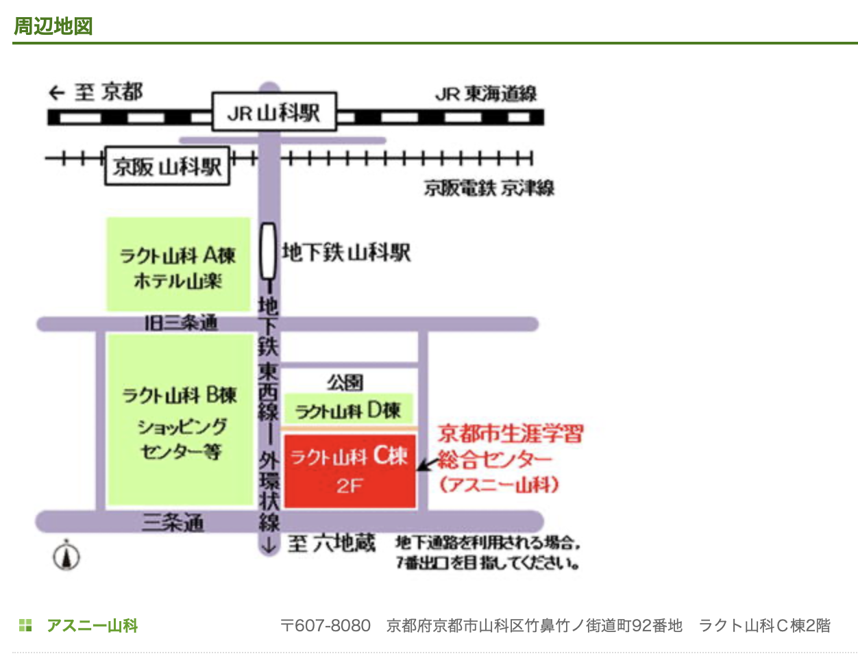京都市営地下鉄東西線「山科駅」、JR東海道線「山科駅」、京阪電車京津線「京阪山科駅」下車、京阪バス「山科駅」下車